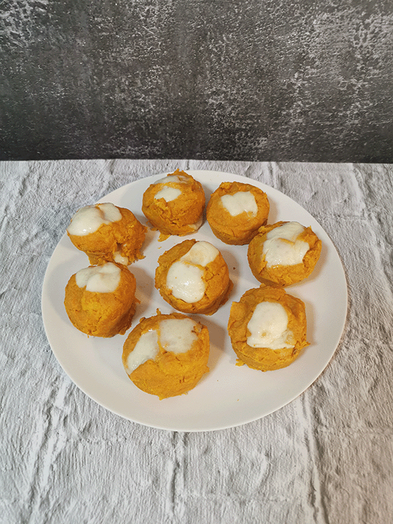 ✔️Vierte la mezcla en el molde deseado, yo de magdalenas, sin llenarlo del todo, pon un trozo de queso y tapa con más mezcla. Decora con más queso.