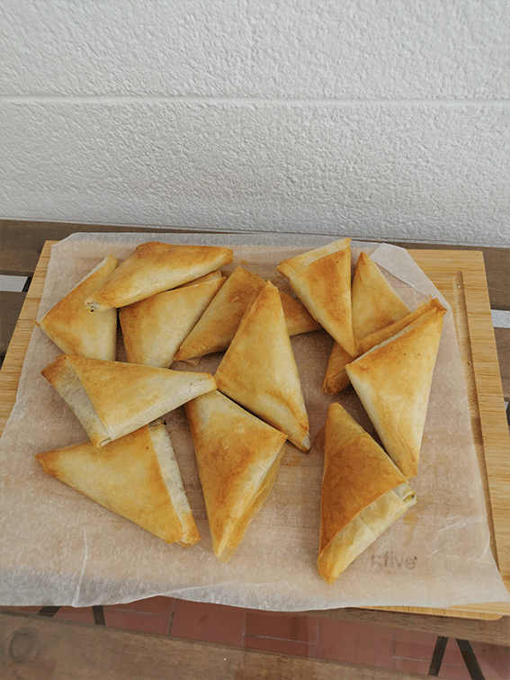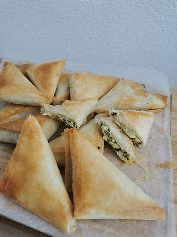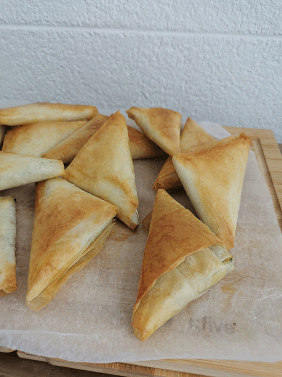 ✔️Estira una lámina de masa fila, pincela toda con aceite de oliva virge extra (AOVE) , dobla como ves en el video.