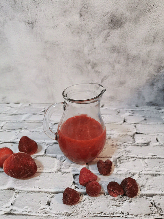 ✔️Para el Sirope de frutos rojos puse unas pocas fresas y frambuesas (de las congeladas) con medio vaso de agua y un poco de azúcar a hervir unos 5 minutos y cuando estuvo todo blandito, lo trituré (sin colarlo) y listo. Está delicioso.
